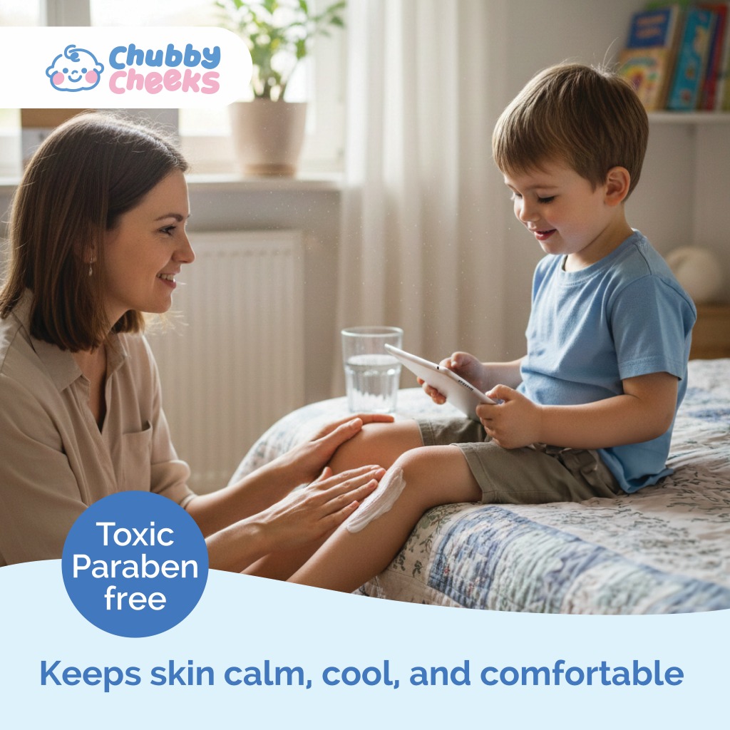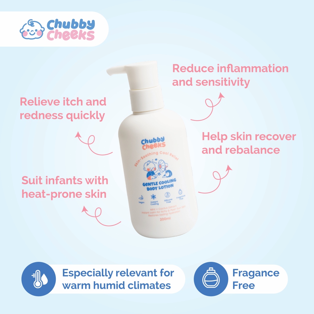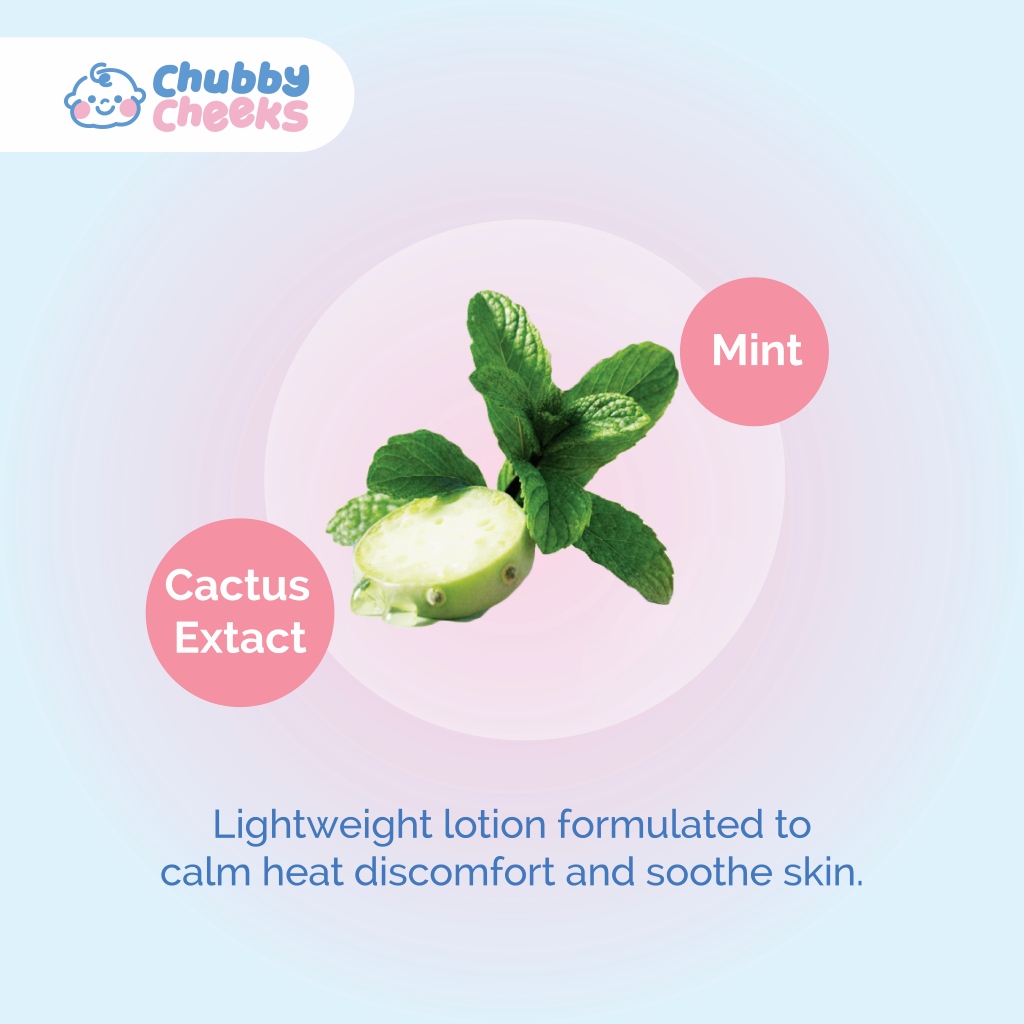 Clinically formulated with Mint and Cactus Extract, Chubby Cheeks Gentle Cooling Baby Lotion is a fragrance-free, lightweight lotion developed for sensitive, heat-prone infant skin. Made for Malaysia’s warm, humid conditions, this formula soothes heat rashes and post-outdoor irritation on contact, reduces inflammation, and helps skin recover and rebalance from infancy onwards.
